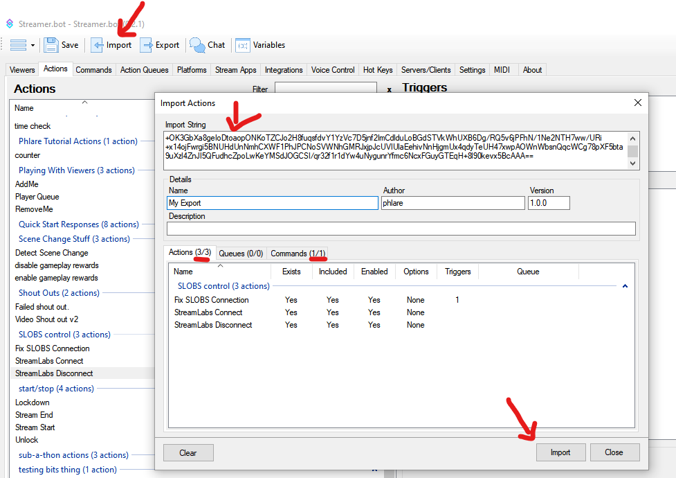 The Fix SLOBS connection is also, by default, wired up to a command called !fixSLOBS. If you want to use this command, enable the command in the commands tab after importing and configure permissions if necessary. These permissions should already be set, but I don't know if they are saved in the export file.