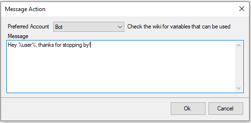 In the dialog box that pops up, type the message that you want to have streamer.bot use to respond to new chatters. something like "Hey %user%, thanks for stopping by!"