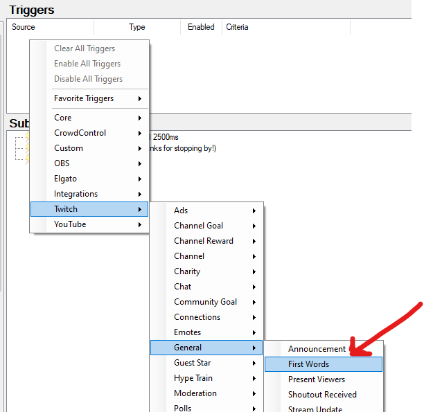 This has become quite easy with the updates in streamer bot 0.2.0. We just need to make a trigger, and we don't even have to leave the action tab anymore. Just right-click in the triggers panel, and choose Twitch -> General -> First Words